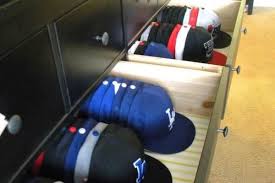 Você pode colocar os bonés um em cima do outro dentro de cestos de plásticos que podem ser empilhados. Assim você otimiza o espaço.